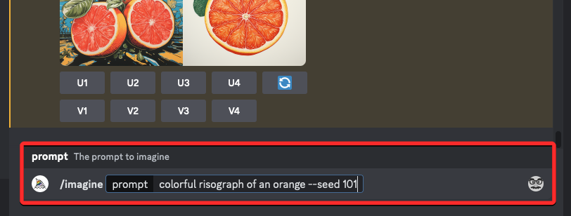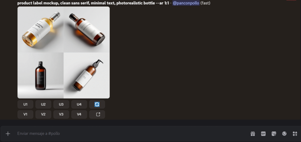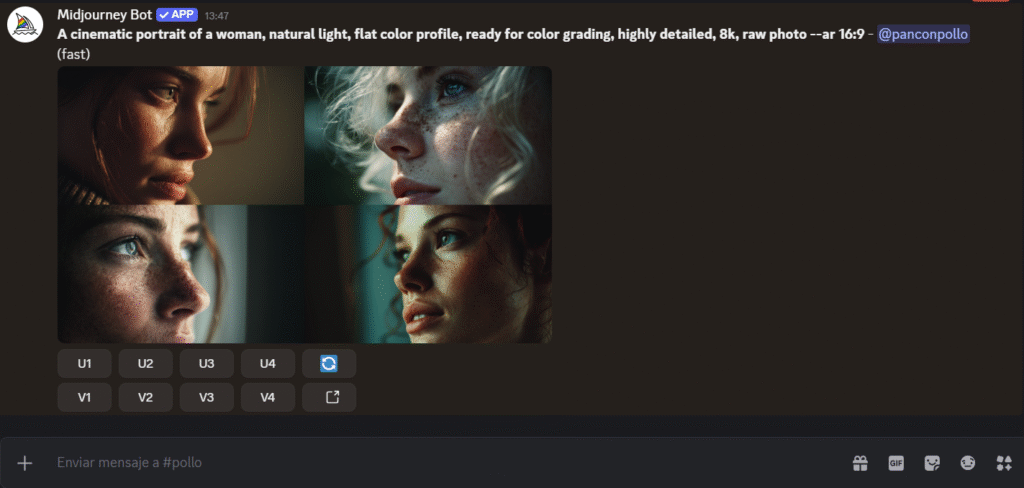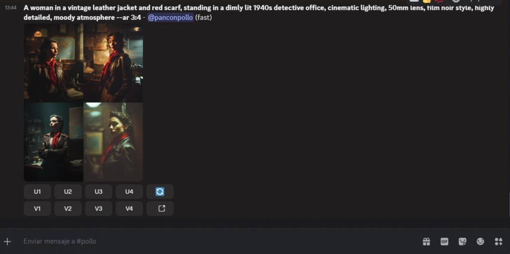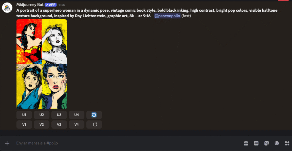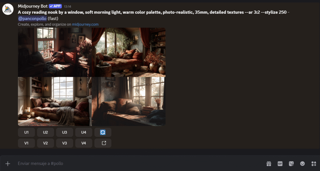 - Usa U (Upscale) para ampliar la que más te guste o V (Variations) para variantes.